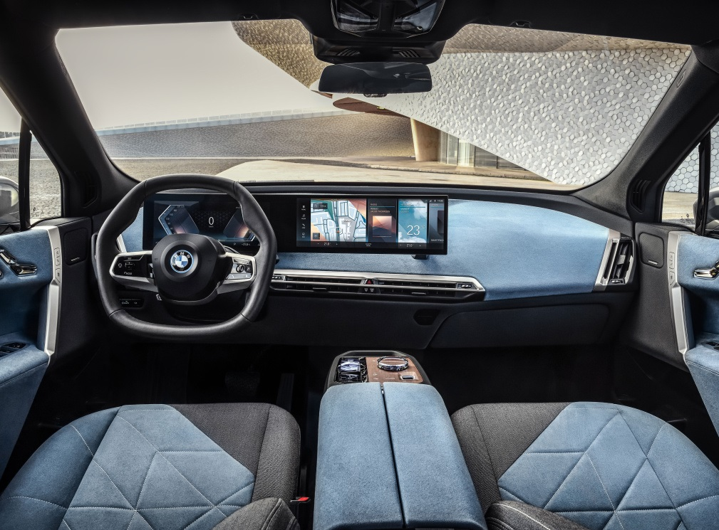 宝马iX车内采用了全新设计风格,主要以简约和科技智能为主。与宝马其它车型相比,宝马iX车内的按键数量减少了50%,并且中控台采用了大量的蓝色翻毛皮材质,使整个内饰看上去更加简洁、时尚。另外宝马iX还采用了12.3英寸+14.9英寸的双联屏设计,官方称,这块一体式曲面屏幕在优化信息显示方式的同时,还可以通过语音、触控等更直接的方式进行操作。动力方面,宝马iX搭载了最新的第五代eDrive电力驱动系统,配备前后双电机,系统综合最大功率为370千瓦,WLTP续航里程预计将超过600公里。