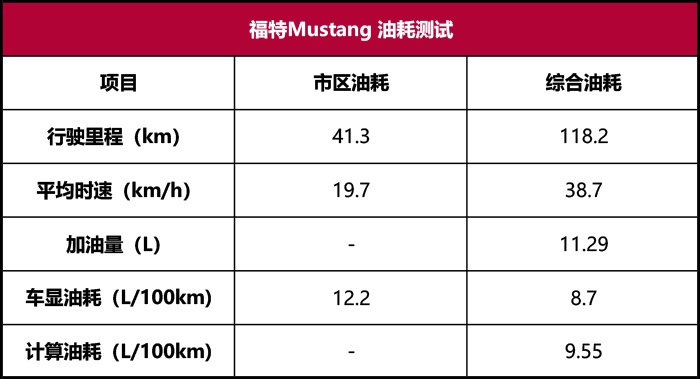 经过了长达3个小时的测试以后,福特Mustang在城市重度拥堵工况下的表显油耗达到了12.2km/h;而在高速工况之下,其百公里油耗更是下降到了6.7L/100km;最终表显综合工况的总油耗为8.7L/100km。经过加油计算,福特Mustang在平均时速38.67km/h,总里程118.2km的测试工况下,实际油耗为9.5L/100km。