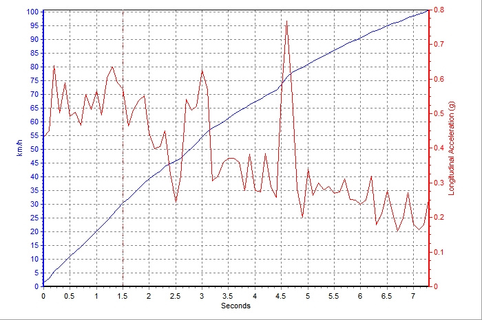 分析G值表能够看出,福特Mustang在起步的瞬间响应还是非常快的,在第一时间就将动力传输在了轮胎上,G值在第一时间就达到了0.45左右,值得肯定。在直线加速模式下,Mustang的变速箱调校逻辑会变得尤为激进,只要结合速度不要舒适型。于是乎,在G值表中也能够看到在第3、第4.5秒的两段区间内,G值因为换挡的动作而产生了剧烈的变化,在车内的感觉就像是手动挡一般直接且原始。