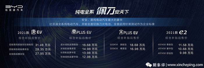 4月7日,比亚迪以“佩刀”为主题,一口气宣布旗下4款纯电新车型正式上市,佩刀意指搭载刀片电池,今后比亚迪在售纯电动车型将全部搭载刀片电池。其中2021款唐 EV指导价27.95万元、秦PLUS EV (配置|询价)售价12.98-16.68万元、宋PLUS EV指导价16.98-18.68万元,2021款比亚迪e2 (配置|询价)售价为9.98-11.58万元。以上4款车型因应配置和价格的不同,续航里程设定为在400-600km之间。