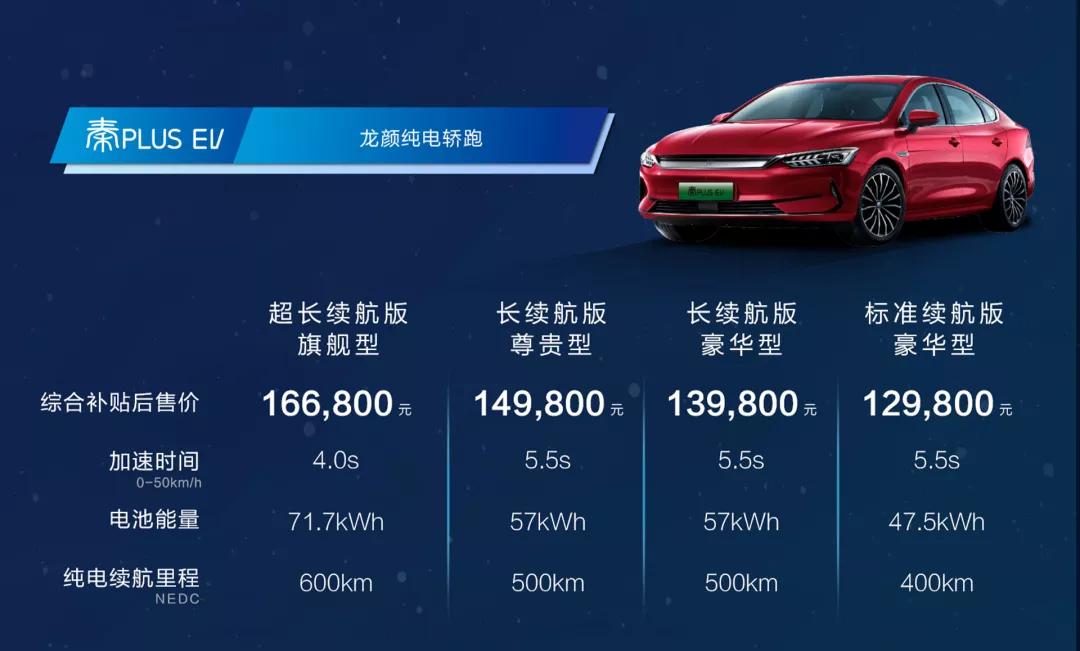 秦PLUS EV是首次现身,它和DM版长得类似,长宽高分别为4765/1837/1515mm,轴距为2715mm。共推4款车型,电池容量为46.5kWh、57kWh和71.7kWh,NEDC续航里程为400km、500km和600km。驱动电机的最大功率为135kW,官方百公里电耗为12.9kWh。30分钟直流快充,电量即可从30%充至80%。