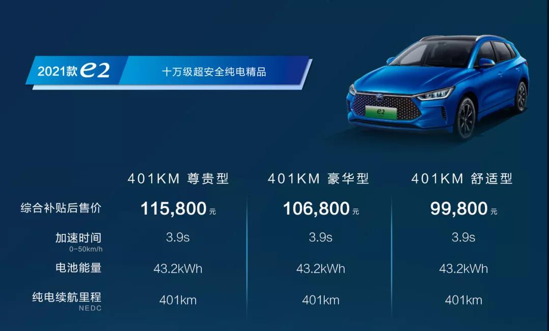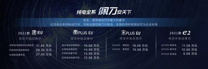 其中,2021款唐EV综合补贴后价格为27.95-31.48万元,秦PLUS EV (配置|询价)综合补贴后价格为12.98-16.68万元,宋PLUS EV (配置|询价)综合补贴后价格为16.98-18.68万元,2021款e2 (配置|询价)综合补贴后价格为9.98-11.58万元。