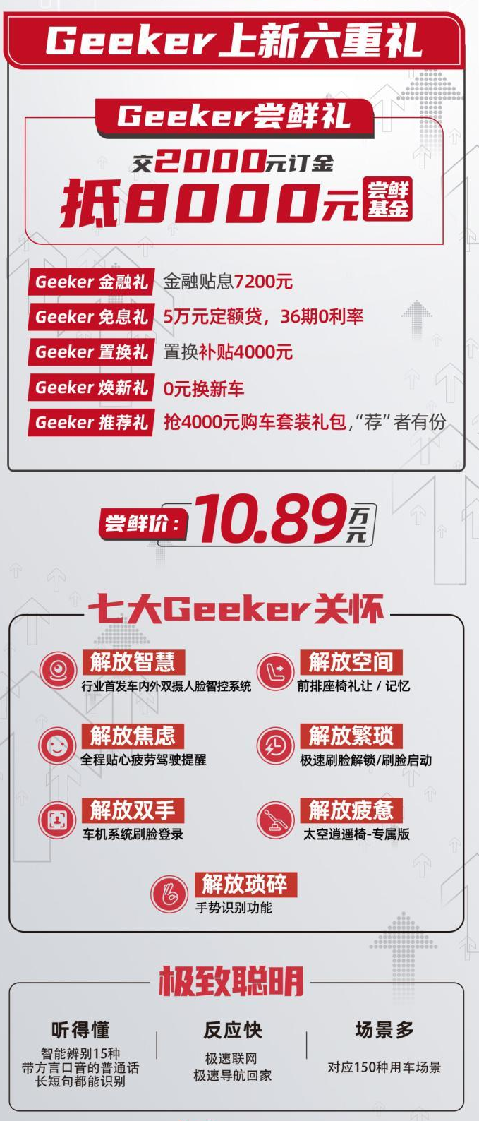 4月9日,长安欧尚X7 Geeker版正式上市,新车共推出1款车型,指导价为11.49万元,现在下订单可享受上市尝鲜价10.98万元(即交2000元订金就可抵8000元购车款)。同时,长安欧尚X7 Geeker还推出了其他上新福利: