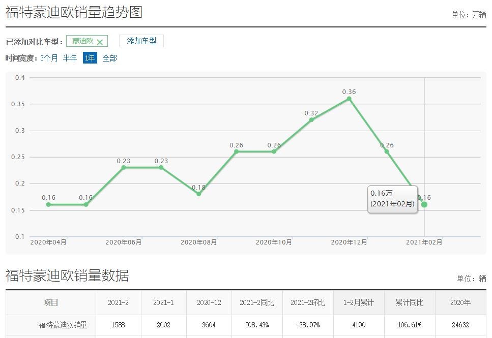 从最近几个月的时间来看,蒙迪欧实际的销量表现都不太好。2020年12月还能交出一份3604辆新车的销量成绩单,2021年1月就只有2602辆新车的销量数据,到了2月更是直接下滑到了1588辆,面对如此惨淡的终端市场销量表现,长安福特或许也早已经在筹划蒙迪欧车型的未来。