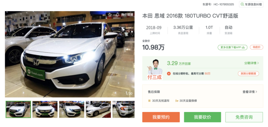 以某二手车网站售出的车型为例,一台2016款的十代思域(1.0T CVT),当时新车指导价为12.79万元,开了三年后可以卖到10.98万元,不算购置税仅折损了不到2万元。