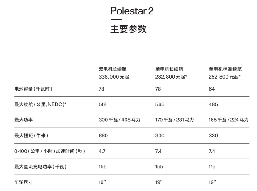 极星2双电机长续航版本搭载前后共300kW电机驱动系统,百公里加速4.7秒,NEDC续航增加至512公里。单电机标准续航搭载165kW单电机,匹配64kWh电池包,最大续航为485公里。