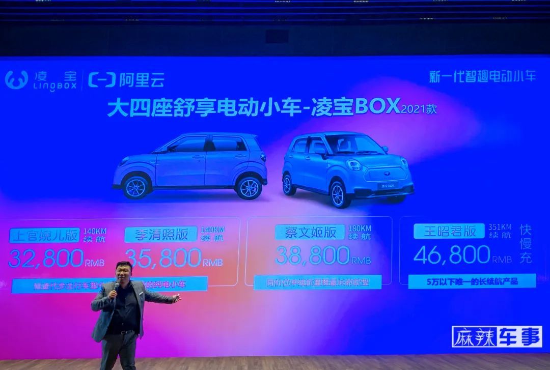 4月12日,在与阿里云的签约合作仪式现场,凌宝BOX 2021款车型共推出了四个版本。其中,上官婉儿版和李清照版,价格分别为3.28万和3.58万元,续航里程均为140KM;蔡文姬版价格为3.88万元,续航里程180KM,与市场上同价位车型相比,续航里程最长;王昭君版价格为4.68万,续航里程351KM,充电方式支持快充和慢充,是5万元以下唯一长续航产品。