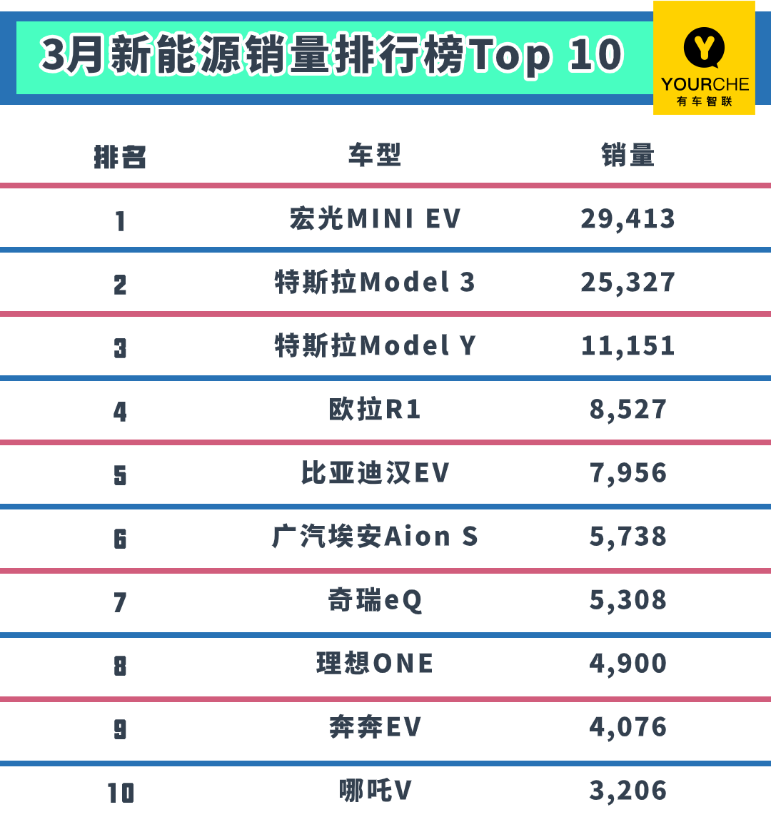 不过,尽管特斯拉在今年3月的表现很出色,但总销量依旧不敌排在榜首的宏光MINI EV (配置|询价)。从榜单中可以看到,3月MINI EV的销量达到了3.9万台,一季度总销量更是突破了7万台,成为了一款名副其实的“国民神车”。另外,在近期宏光MINI EV还推出了马卡龙版本,也正因为这款车,就连五菱宏光的官网首页也变得五彩缤纷起来,相信凭借着更加青春靓丽的配色和更丰富的配置,MINI EV在今年4月还会有一波新的销量增长。