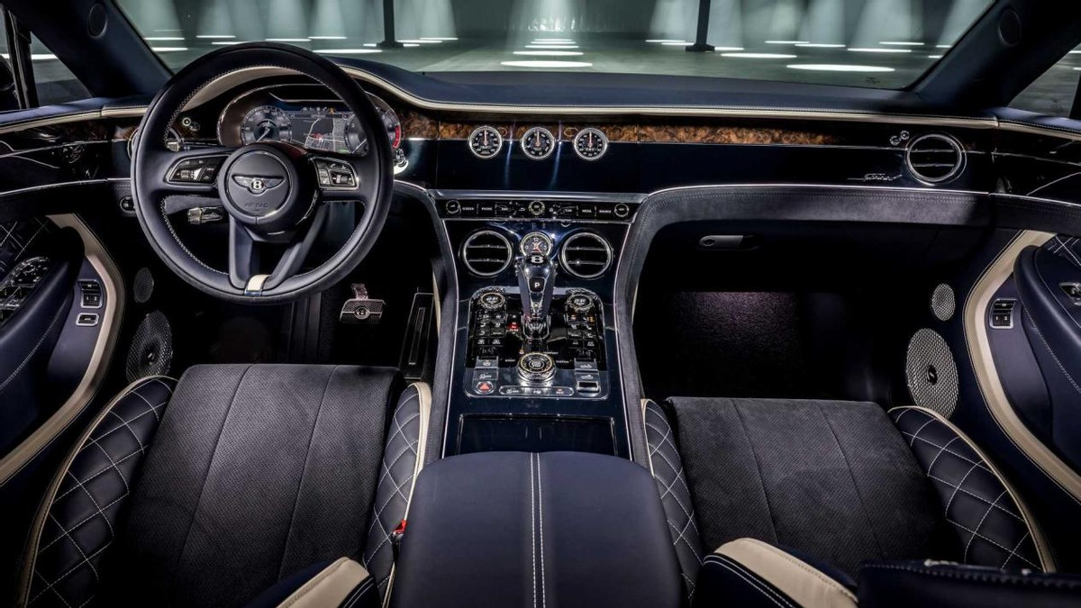 内饰方面,方向盘采用了Alcantara面料包裹搭配真皮,中控台上安装有“Bentley旋转显示器”。当发动机启动后,中控台上的木质面板会翻转,新车搭载12.3英寸触控液晶屏。屏幕内置有距离传感器,当手指靠近时,传感器会感应到并突出显示相应图标。