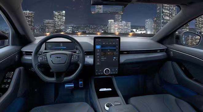 新车内饰简约大气,车内所有的惊喜都集中在了智能化体验之上。首先在智能交互体验上,Mustang Mach-E搭载新一代的SYNC+ 2.0智行互联系统,携手百度生态,集成百度数据、云、地图、语音、支付等原生能力,为用户打造具有流畅使用体验的智能座舱。