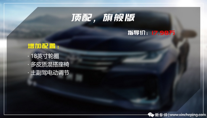 终于来到了最顶配旗舰版,售价接近18万,成功和大哥亚洲龙最低配进取版形成价格阶梯。和尊贵版相比其增加的配置有:18英寸轮圈、混搭皮质座椅、多项主副驾电动调节。作为顶配车型,旗舰版终于是将最后的配置补齐了,顶配性价比普遍都不会很突出,适合那些预算充裕的人去选择。其实综合尊贵版和旗舰版之后会发现,这两款配置在优化上如果和最低配、次低配之间逻辑相同,揉合成一个版本,那么选择会清晰很多。