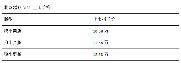 4月16日,北京越野全SUV ——BJ30 (配置|询价)正式上市,上市指导价10.58-12.58万。作为北京越野旗下由“专业越野”向“泛越野”下探的全新力作,新车延续了大众对其“小战狼”的称谓,别开生面的以专属动画IP形象“三只小狼”的名字“狼小美版、狼小奔版、狼小野版”命名三个版型,其后还跨界联合网红零食品牌“三只松鼠”共同完成新车发布,可谓别具一格。那BJ30到底有什么产品力亮点呢?