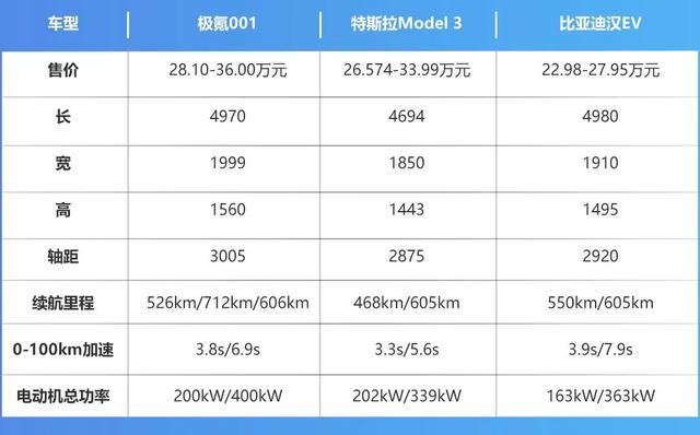 而这样的产品力放在同级中绝不怯场,从售价、定位等方面来看,极氪001未来的竞争对手除了行业公敌特斯拉Model 3之外,还有目前比较热门的比亚迪汉EV (配置|询价)、小鹏P7 (配置|询价)等车型。从下表可以看到,极氪001在空间、续航、性能方面的表现都有一定优势,但同时它的售价也相对更高一些,抢先下单的话,在官方优惠之后售价其实是26.6万与34.5万,仍略高于部分市场预期。