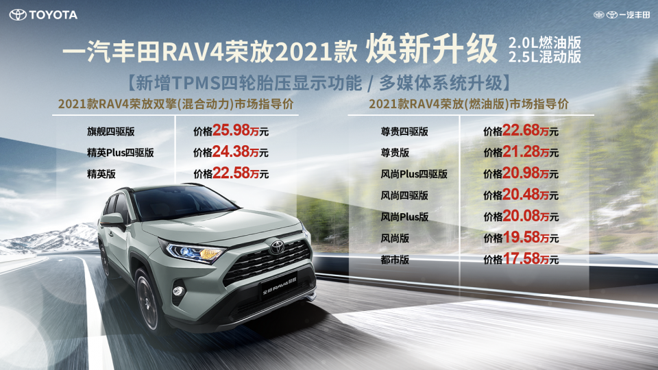 4月17日,RAV4荣放 (配置|询价)双擎E+正式上市,24.88-29.68万元的价格区间凸显了不错的竞争力。与此同时,新款(2021款)RAV4荣放燃油版也迎来了上市,共推出7款车型,售价区间为17.58-22.68万元;新款(2021款)RAV4荣放双擎共推出3款车型,售价区间为22.58-25.98万元。