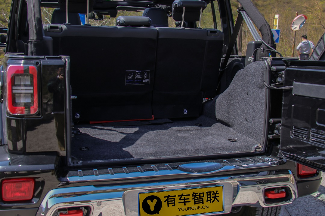 我和小羊每次出来拍车、试驾都要带好多东西,三脚架、相机、行李箱,大包小包一大堆,所以试驾车的后备厢也是我们比较担心的问题,因为我们要把所有设备都放在里面。不过好在BJ40城市猎人版后备厢的空间表现还是不错的,在常规状态下,有着532升的容积,完全够用,如遇到特殊情况可将后排座椅放倒,这样后备厢的容积就提升到了965升,而且放倒后地台也能够达到纯平角度。如果是单独带着家人出来露营,这样的空间表现能给你满满的安全感。值得一提的是,台车的后尾门和后挡风玻璃都是可开启的,并且后备厢地板十分平整,这样的设计让我们搬卸行李、设备更加方便。