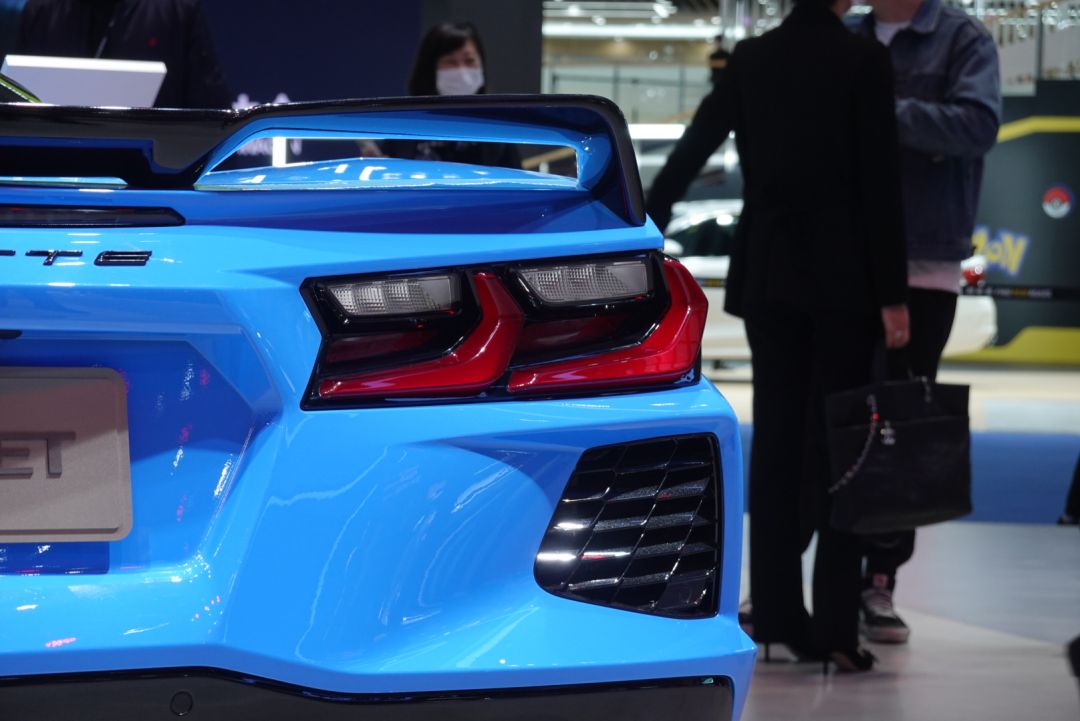 车尾部分,新款科尔维特C8的尾部设计继承了美式经典肌肉跑车的力量美感,车尾左右两侧的尾灯组采用了LED光源的“L”形灯带,熏黑的保险杠配合扩散器以及双边共四出的方形排气,战斗感非常足。