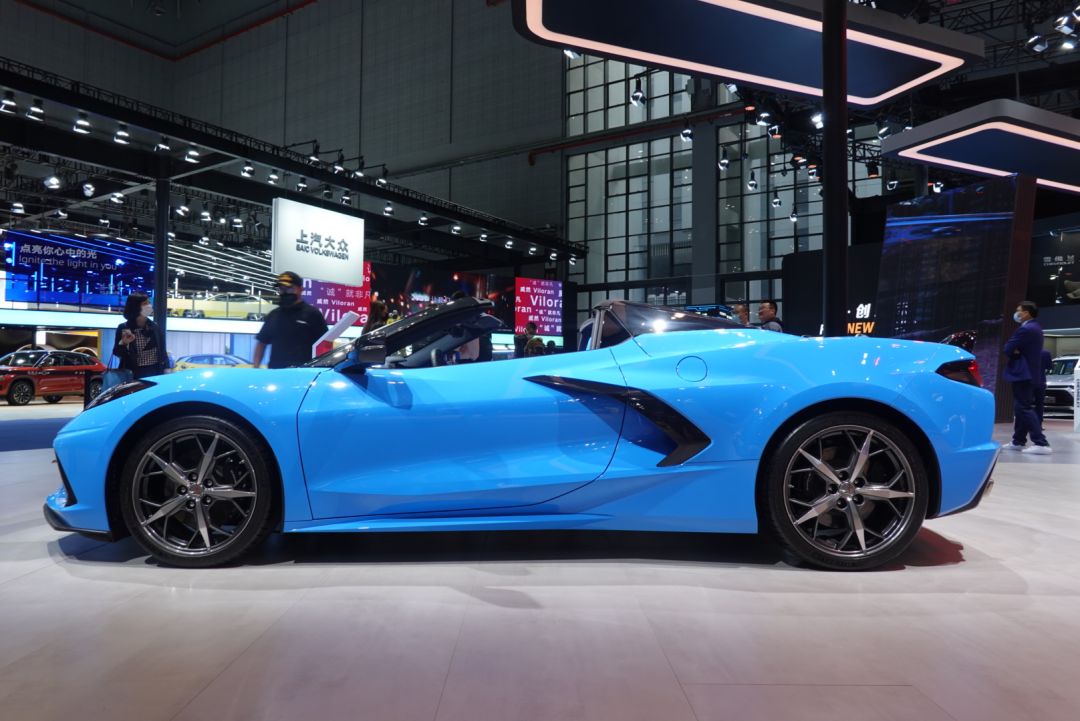 从侧面来看,新款科尔维特C8最大的亮点是采用了硬顶敞篷结构,其车身设计灵感来源于战斗机,低矮的车身配合经典折痕式水平腰线和双五辐式大尺寸轮圈,看起来攻击性极强。此外,作为发动机中置布局的跑车,该车的侧面还带有尺寸较大的进气口,同时车子的门把手也与进气口融为一体。