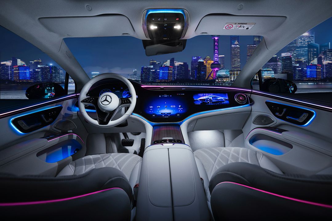 内饰方面,新车的设计完美诠释了如何将科技与豪华二者兼具。首先映入眼帘的,就是中控台上所布置的超大尺寸一体式三联屏了,整块屏幕的宽度超过1420mm,并在内部搭载有MBUX Hyperscreen系统。据悉,这块大屏拥有12个传感器,并具备AI人工智能学习能力,使车内有着极强的科技气息。值得一提的是,两侧奔驰标志性的涡轮造型空调出风口也被融入进了大屏中,使车内也有着出色的整体性。