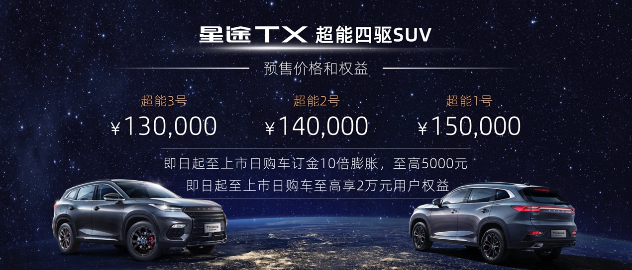 “13万级最强四驱SUV”星途TX“超能四驱版”同步开启预售,超能3号售价13万元、超能2号售价14万元、超能1号售价15万元,新车凭借领先同级的10大超能配置,将以高水准驾控乐趣为年轻用户带来超越期待的满分选择。