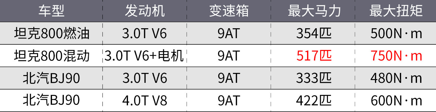 至于动力方面,坦克800将搭载长城最新的3.0T V6发动机,最大功率354马力,最大扭矩500N·m,匹配长城自主研发的纵置9AT变速箱。除了纯燃油动力外,坦克800还会在3.0T+9AT的基础上,增加一套P2混动系统(电机位于变速箱内部),综合功率可以达到517马力,峰值扭矩750N·m,比BJ90上装配的奔驰4.0T V8发动机还要强劲!这样的动力水平,足以称得上国产燃油车的巅峰了。