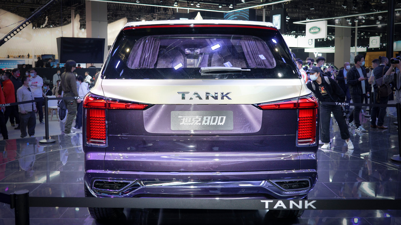 如果说坦克800的车头是霸气,车侧是沉稳的话,那么尾部就可以说是非常个性了。首先,车顶最上方的小尾翼位置有一条红色的贯穿式刹车灯条,这种设计还是非常罕见的。尾门中央是硕大的TANK英文拼写,两侧则是宫殿挂灯一般的尾灯组。通过不同颜色、棱角的搭配,营造出了坦克800独一无二的尾部辨识度。