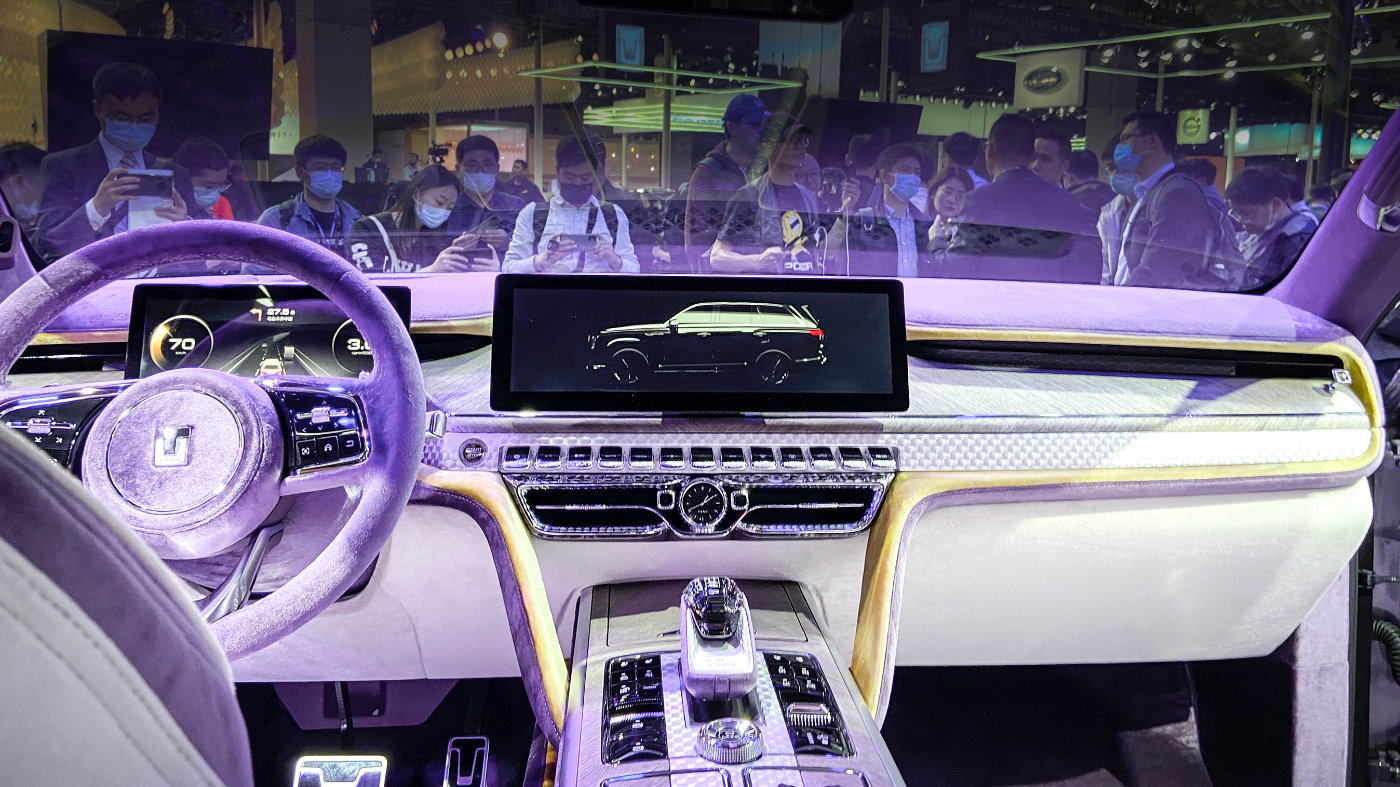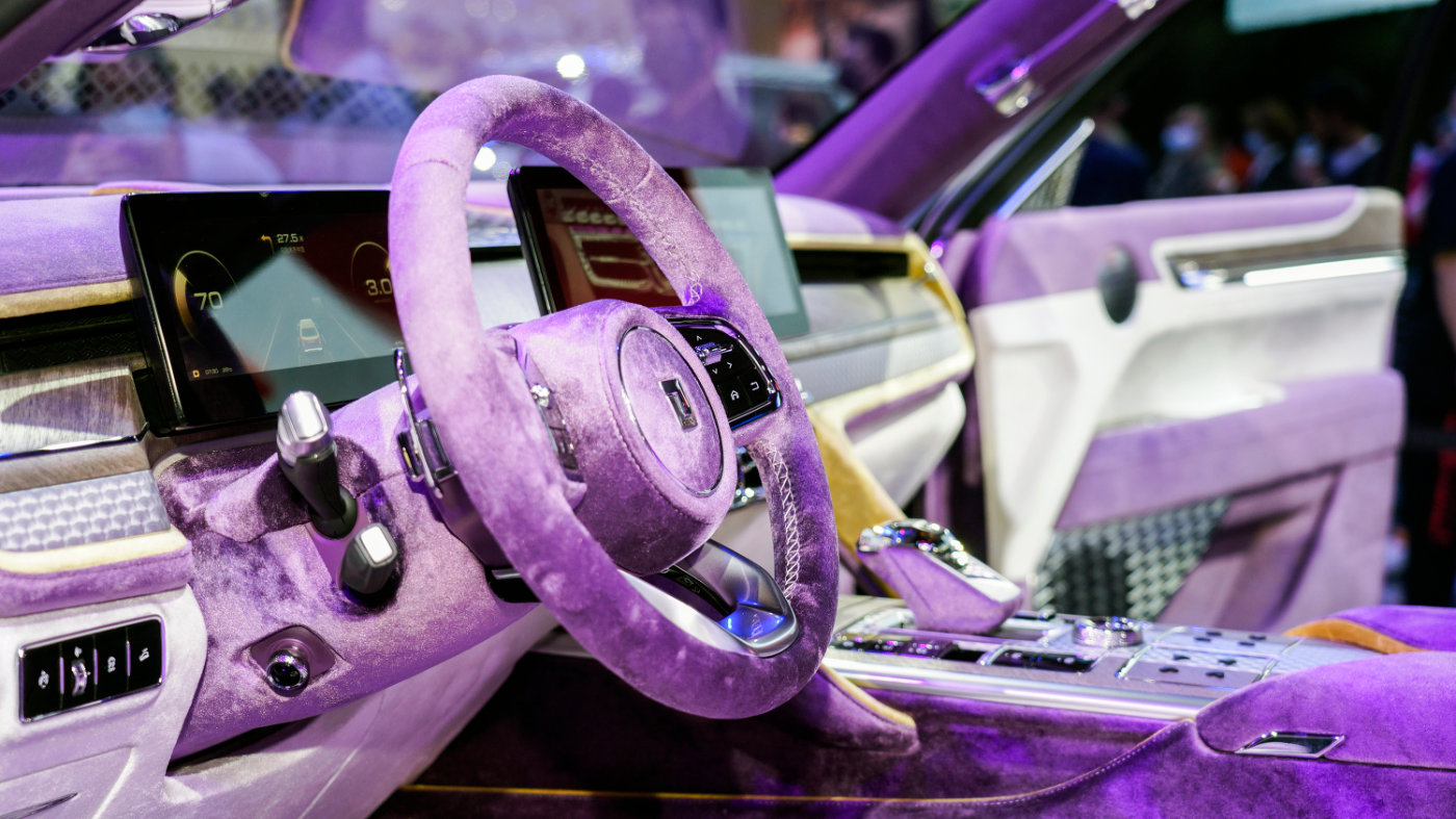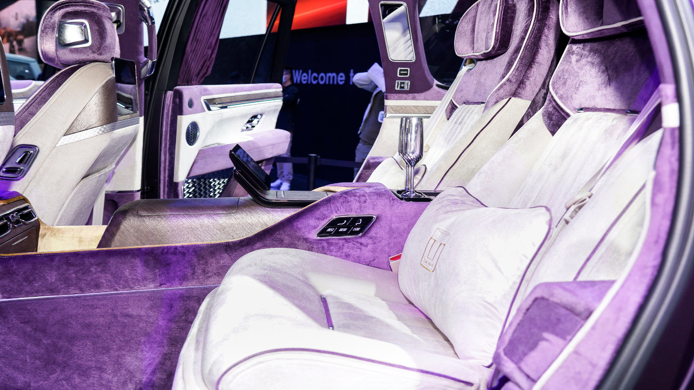坦克800的内饰同样别出心裁,除了两块横向液晶屏负责显示信息外,依然保留了大量的实体按键,这也是很多超豪华品牌在使用的手法,毕竟液晶屏想营造豪华感真的不太现实!坦克800内饰最大的特点在于采用了紫色的天鹅绒材质,覆盖了方向盘、中控台、车顶、座椅等等部位。