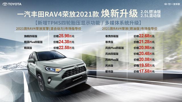 再来看配置方面,2021款RAV4荣放及2021款RAV4荣放双擎也带来了不小的优化,两种动力版本车型全部升级多媒体系统,增加TPMS四轮胎压显示功能。