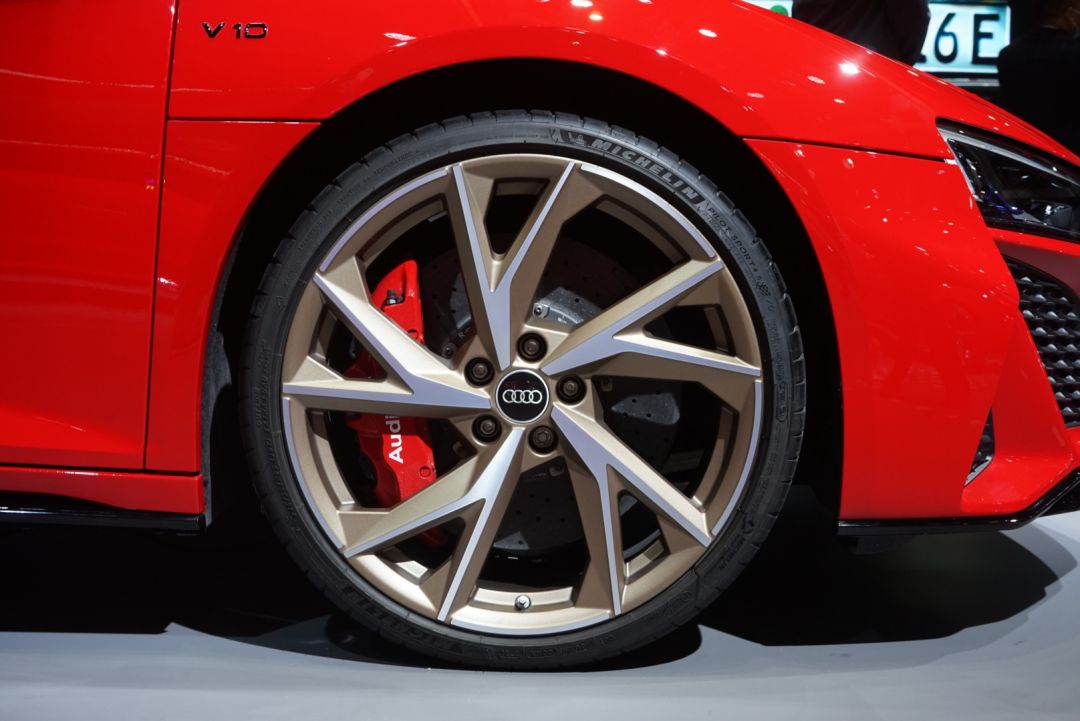 从侧面来看,新车依旧采用R8经典造型,并加入了更加流畅的线条设计,新车还在车门后方配备了一块黑色进气口,可以给发动机提供更多的新鲜空气。同时,新车还使用了大尺寸红色刹车卡钳与碳陶刹车盘的组合,给整车营造出极强的战斗气息。