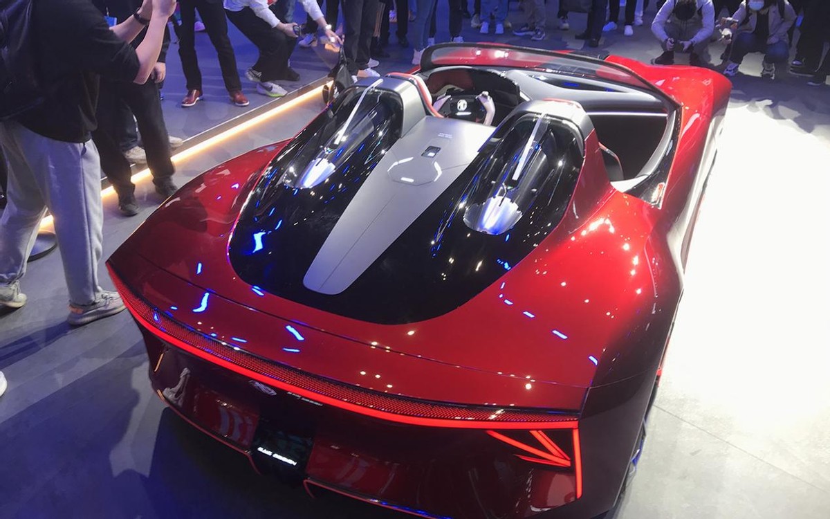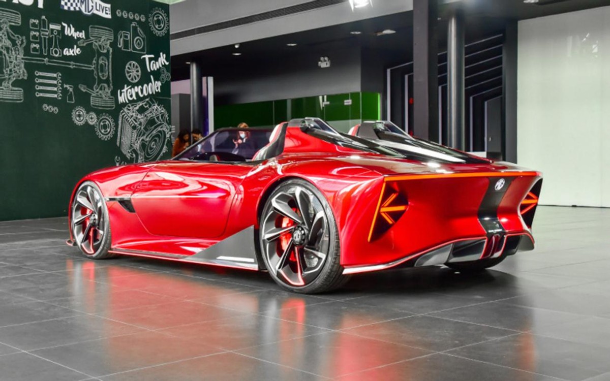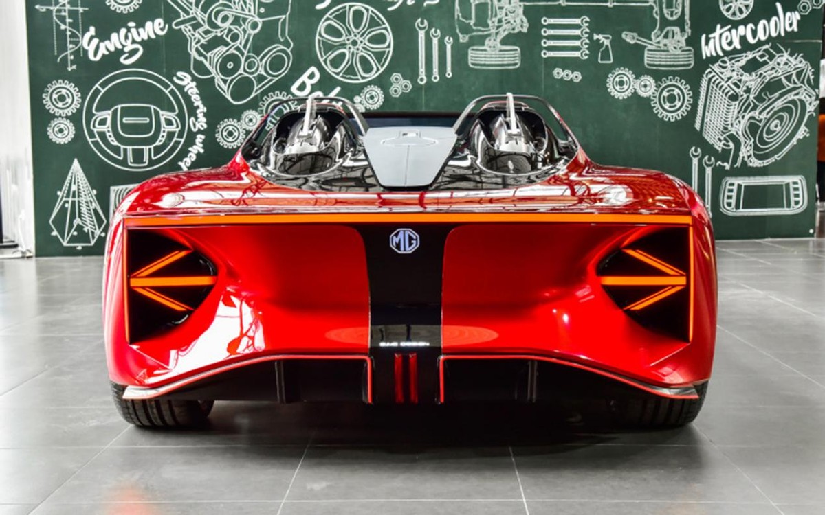 至于车尾,MG Cyberster使用了一套名为“赤翼的立体式贯穿尾灯设计”,从这一正后车尾给人的感觉来看,我认为完全不输海外的那些超级跑车。此外,尾灯、箭头式转向灯、发光LOGO均采用了一体嵌入式的设计,所以整体视觉效果也足够吸睛,极具辨识度。
