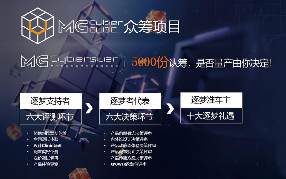 用官方说法来表述就是,此次共创车型项目众筹目标份数为5000份(1份为1000元,总计500万)。从4月19日起到7月31号,用户可登录MG CyberCUBE用户共创平台,只需支付1000元“逐梦金”即可参与众筹。而一旦达到众筹份数,即判定为立项成功。