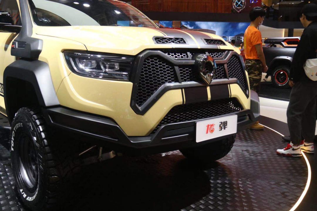 外观方面,龙弹炮特别版相比普通版车型有较大的升级优化,黑黄色的车身涂装,让其好像一个“沙漠领主”。同时,其进气格栅与前包围也进行了全新的设计,进气格栅内部还采用熏黑处理。同时,龙弹炮特别版的发动机盖还采用了隆起造型,并带有进气口,看上去气场更加强大。