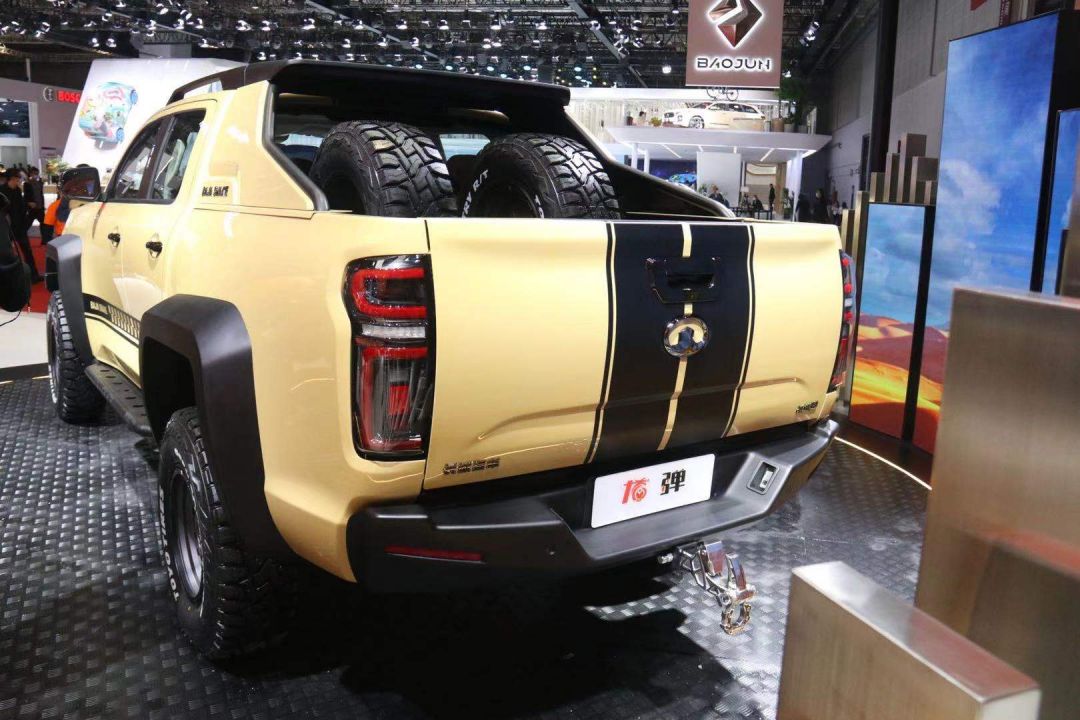 车侧可以看出,相比普通版车型进行了较为明显的升高,更高的底盘会大幅度提高了离地间隙,让车辆拥有更强的接近角、离去角和通过角。新车也换装了AT全地形胎,提升越野能力。此外,新车车顶还配有行李架,货厢内带有双备胎,拥有更强的穿越能力,是一台穿沙好座驾。