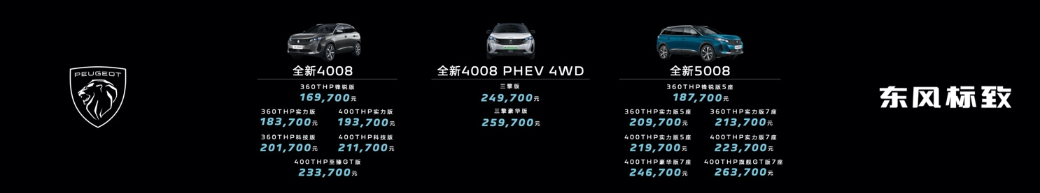 东风标致新法式SUV家族三款车型,新法式臻品SUV 全新4008&新法式高性能混动SUV全新4008 PHEV 4WD&新法式旗舰SUV 全新5008官方指导价分别为,全新4008车型169,700元-233,700元;全新4008 PHEV 4WD车型249,700元-259,700元;全新5008车型187,700元-263,700元。