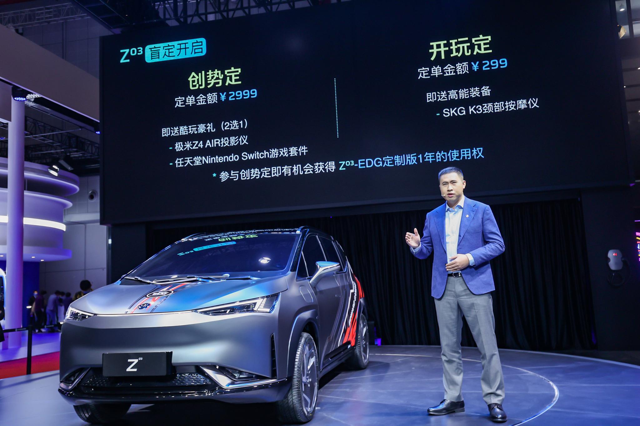 用户还可以同时登陆合创APP参与盲定,分别有2999元的“创势定”以及299元的“开玩定”可以选择。现在下定的用户即可享受定金金额等额冲抵购车款的权益,同时有机会获得SKG K3颈部按摩仪、极米Z4 AIR投影仪或任天堂Nintendo Switch游戏套件等超值、豪华礼品。如果选定EDG版的用户,在车辆交付时还能获得一个限量版盲盒,而盲盒里面的礼物也交由用户来定义。另外,针对创世定用户,合创汽车将抽取一名幸运观众,赠送Z03顶配车型一年的使用权。虽然还没有定价,但Z03的价格预计在13-15万之间,对Z世代用户有着不错的吸引力。