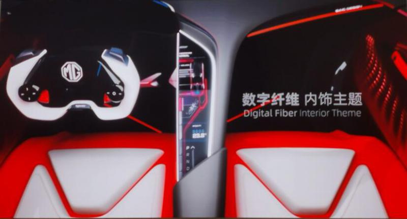 MG Cyberster采用了双门两座的布局,超长的车头沿袭了中置发动机超跑的外形特色。从现场来看,这款车还采用了类似蝴蝶门的设计,分体式座舱和异形方向盘等超跑元素可谓应有尽有。内饰的设计以数字纤维为主题,结合电竞风格的方向盘等元素,打造出了全球首款纯电超跑电竞座舱。红白搭配的内饰和一体式零重力座椅所带来的运动感也让人过目难忘。
