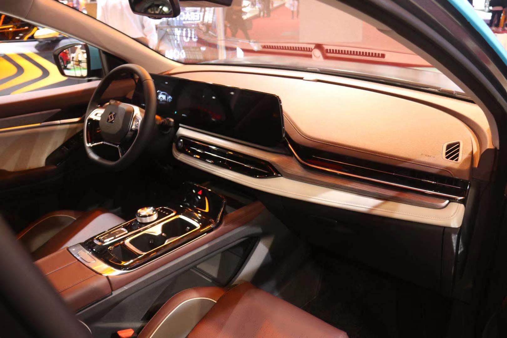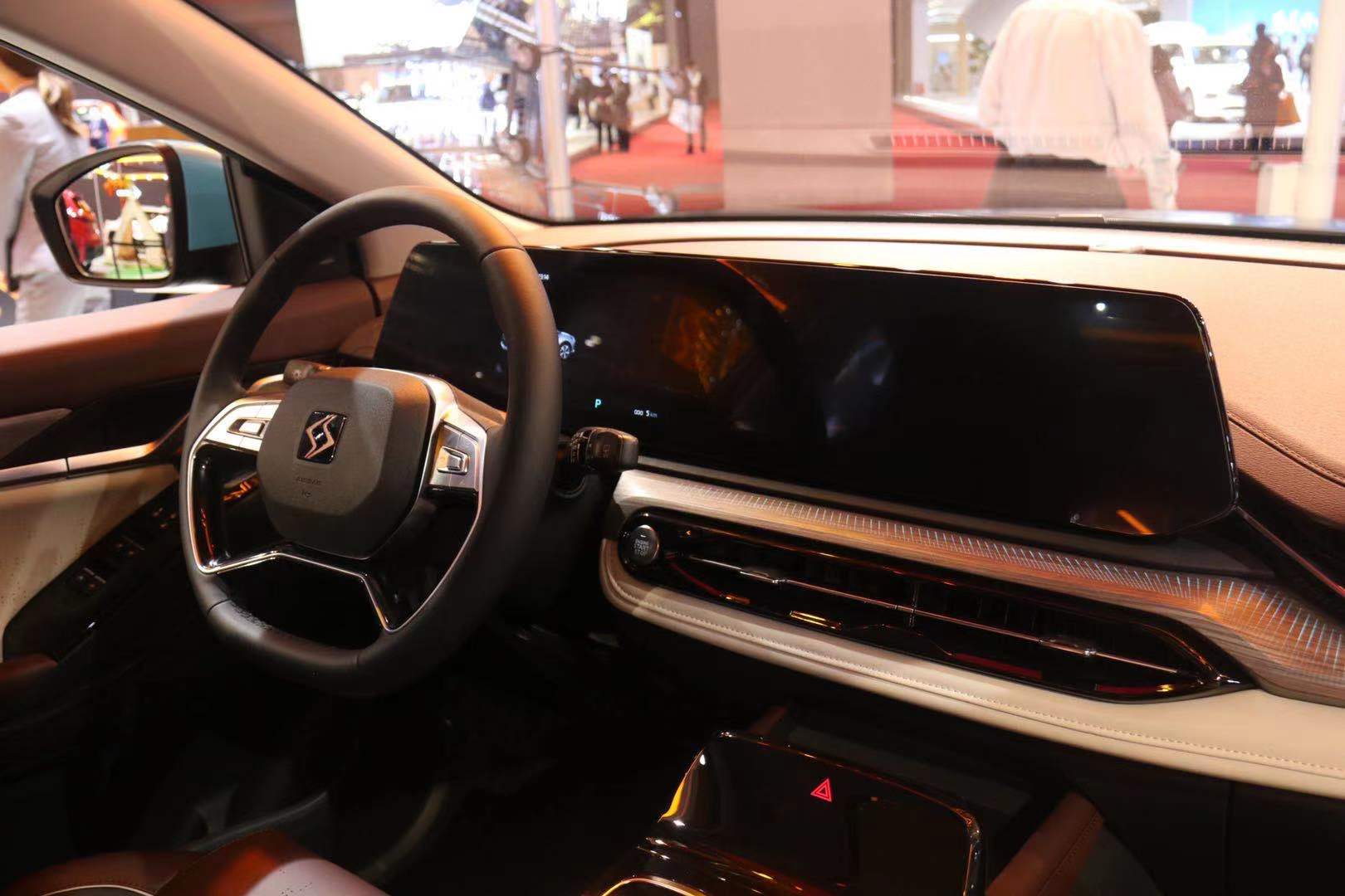 内饰方面,新车座舱采用了环抱式设计,并且中控区域也向驾驶员一侧略微倾斜,整体看上去十分协调。科技感营造方面,新车配备了一块悬浮式的一体式车载大屏,该屏幕集成了全液晶仪表以及中控屏,并且支持双屏互联,导航信息能够滑动投屏到驾驶员视线前方,十分便捷。