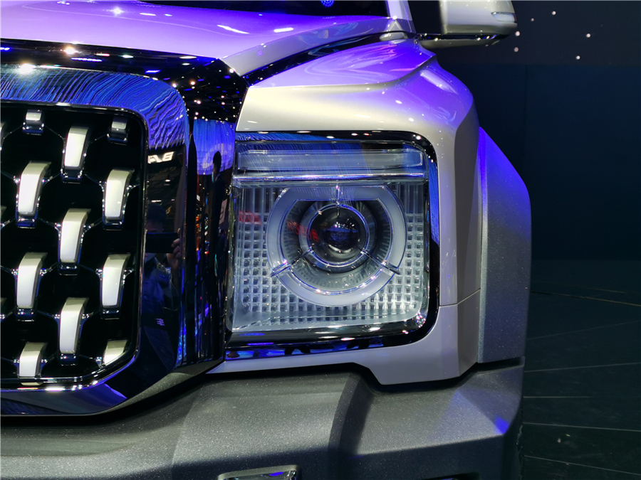 而在本届上海车展亮相的长城“X炮”,就是基于全新“坦克平台”打造而来的首款全尺寸皮卡,官方宣称长城“X炮”将会搭载3.0T V6+9AT/9HAT超级动力组合。下面,我们来一起回顾一下这款车。该车的整体外观设计风格走的是硬派越野路线。具体来看,新车的前脸采用了霸气十足的大尺寸中网,搭配内部的镀铬点缀以及粗壮的镀铬外边框,颇具有辨识度。车头两侧方形前大灯的内部结构与“天使眼”有些相似,其外边缘加入了镀铬饰板进行装饰,增添一丝豪华感。此外,该车硬朗的前杠上方将全尺寸皮卡野性粗犷的风格完全展现出来。