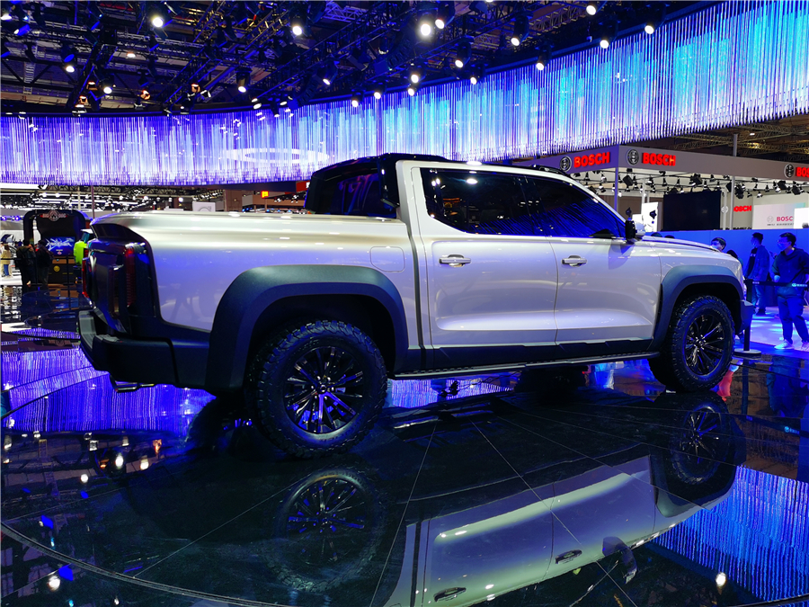 从侧面来看,新车采用了大量的平直线条,营造出了高达威猛的视觉观感。此外,我们本次拍到的展车还配备了全路况越野轮胎,也就是俗称的AT胎,并且车门下部还配有方便上下车的踏板。在车尾部分,这款全尺寸皮卡采用了贯穿式尾灯,该尾灯可发光面积较大,而下方的后保险杠为黑色设计。