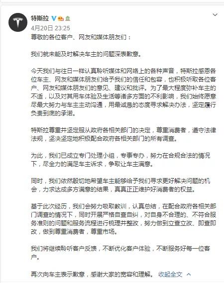 特斯拉官方并未就此事作出任何回应或跟进,直到该事件登上了央视新闻,特斯拉才知道悔改,并在4月20日晚11时通过微博发文,就未能及时解决车主的问题深表歉意,同时还表示之后会更好的聆听客户反馈,不断优化用户体验等相关公关客套话。