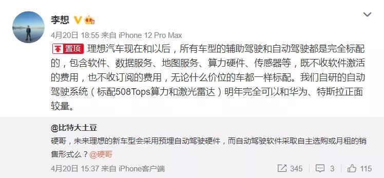 但理想汽车创始人李想近日在微博表示,理想汽车从现在开始,所有车型都将标配驾驶辅助和自动驾驶硬件,包括软件、数据服务、算力硬件等都无需额外花钱选装,无论什么价位的车型,以上功能和硬件都是标配。