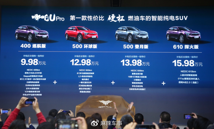 车展现场,哪吒U Pro正式上市。新车推出400 巡航版、500 环球版、500 登月版、610 探火版四款车型,补贴后官方售价分别为9.98万、12.98万、13.98万、15.98万元。针对哪吒U Pro上市,哪吒汽车推出极致金融礼、终身保驾礼、护航无忧礼,为消费者提供超值的购车优惠。
