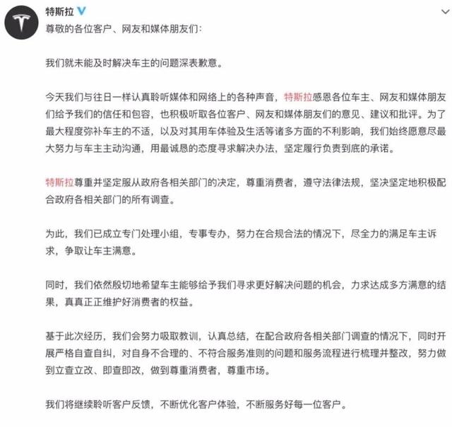 不知道特斯拉是否是迫于压力,4月20日晚,特斯拉官方微博发出道歉声明,声称自己没有很好地解决车主的诉求,会遵守法律法规,同时积极配合相关部门进行检测,尽快给到维权女车主一个满意的答复。