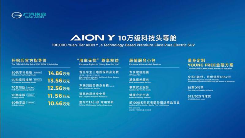 在4月19日开幕的2021(第十九届)上海国际车展上,汽埃安AION Y (配置|询价)正式上市,补贴后的官方指导价为10.46万元-14.86万元。首任车主可享受三电质保终身免费、车联网服务终身免费、道路救援终身免费等一系列“用车无忧”尊享权益。另外还提供“超值服务小包”,包括了新车专享玻璃贴膜、基础保养服务、事故安全服务、健康守护空滤等项目,为年轻车主出行提供便捷服务。
