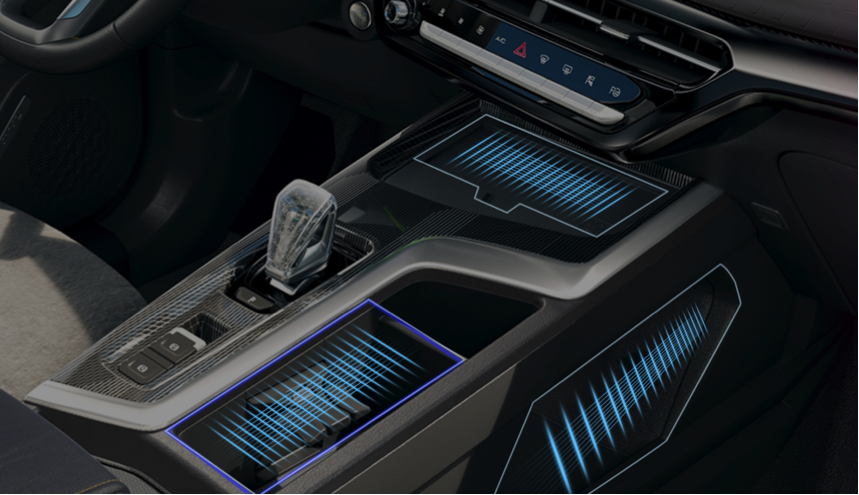 环抱式中控台的设计是以战斗机座舱为灵感,搭配上凌厉的线条,翻毛皮质运动座椅以及仿碳纤维材质装饰,让整个车内战斗感爆棚。当然悬浮式中控屏、全液晶仪表、科幻5D档把也为车内增加了不少科技氛围。