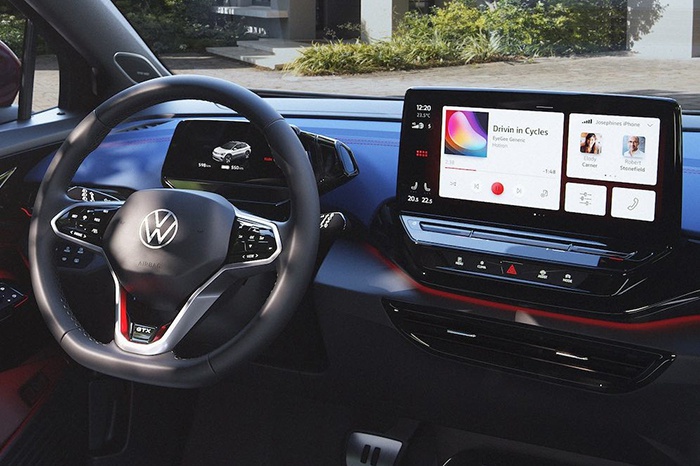 至于车厢内饰,ID.4 GTX的车厢内部采用了大量富有运动感的线条及色块进行点缀,大面积的中控面板都采用了蓝色的配色,并在中控、门板等部分都用上了红色的饰条进行点缀,效果相当出色。