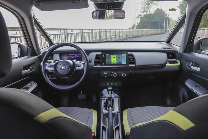 新飞度的前脸看起来亲和力十足,大灯造型回归初代独特的风格,高配车型更是标配了带透镜的LED前大灯,车身和内饰采用了跳脱大胆的拼色设计,车厢的织物更居家,更亲肤,使用了防水的内饰、座椅材质。
