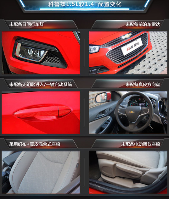 由于定位的不同,全新科鲁兹1.5L车型在配置方面较1.4T版本略有削减,这也直接带来了更具竞争力的价格。具体来说,全新科鲁兹1.5L取消了LED日间行车灯、前泊车雷达、无钥匙进入等功能,不过在倒车影像、倒车雷达等方面依旧得到保留。此外,1.5L车型未配备真皮包裹方向盘、一键启动系统、电动调节座椅等,座椅材质则采用了中间织物两侧真皮的搭配进行设计。值得称赞的是,全新科鲁兹1.5L车型全系标配彩屏,1.5L自动精英版还搭载了MyLink2.0智能车载互联系统。