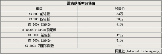 如今,国人对于SUV车型的情有独钟已经成为了一个不争的事实,豪华汽车品牌为了能在华进一步抢占市场份额,纷纷推出尺寸更小、售价更低的中型SUV产品。面对德系三强“ABB”均已有了自己的入门级SUV车型,来自日本的传统豪华品牌雷克萨斯也不甘示弱,即将于年内推出首款中型SUV-NX。近日,网通社从雷克萨斯官方了解到,中型SUV-NX正式公布了预售价,其将推出7款车型,售价为33万-51万元。