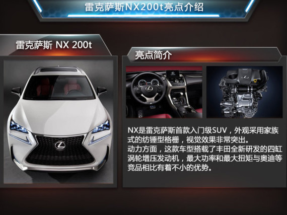 全新NX是雷克萨斯首次在中国进行全球首发的车型,大胆的语言设计和澎湃的动力的性能展示出雷克萨斯未来在华发展的新方向。这款将在10月才正式投产的车型仅仅在1个月之后就将第一时间正式的登陆中国市场,由此可见LEXUS对于国内市场的重视程度。对于该款车型,雷克萨斯NX (配置|询价)系列总工程师加藤武明先生在接受媒体采访时表示:“NX造形非常凌厉,极富进取性。内部装饰也很有运动感,同时给人很舒服的感觉。”