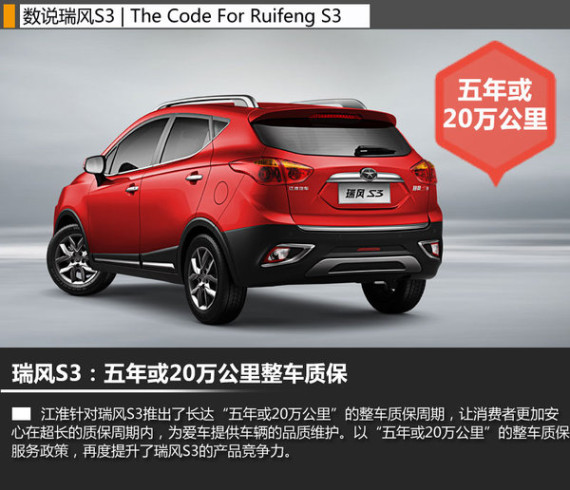 按照目前国内主流自主品牌的整车质保周期来看,包括长城、奇瑞、比亚迪、吉利等,整车质保周期普遍为三年或六万公里。此次瑞风S3在国内市场的小型SUV中,以“五年或20万公里”的整车质保服务政策,再度提升了产品的竞争力。